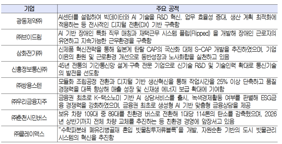 심사위원장을 맡은 유한주 숭실대 명예교수는 "산업 구조 전환이 빠르게 진행되고 기술 변화와 시장 변화가 동시에 일어나는 어려운 상황 속에서도, 참여기업들은 예년보다 훨씬 높은 수준의 혁신 의지와 실행력을 보여주었다"고 평가했다.