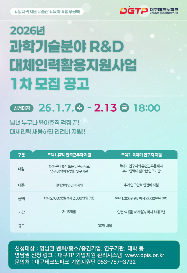 | 제목 | [대구테크노파크] 「2026년 과학기술분야 R&D 대체인력 활용 지원사업」 1차 모집 안내 | ||