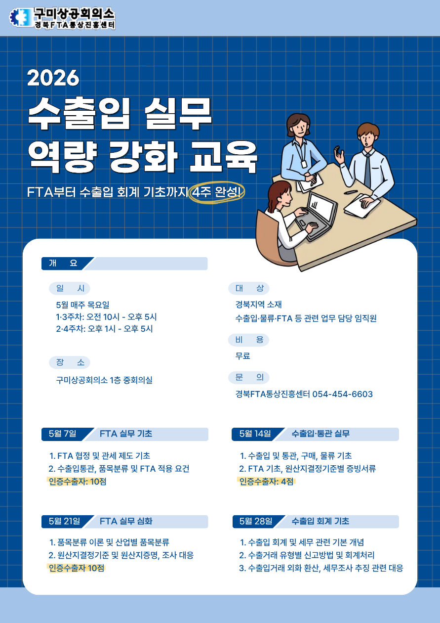 | ▲ | [교육] 5월 2주차 수출입·구매·통관·FTA 전 과정 실무 종합 - 직무 기초 이해 및 대응 |